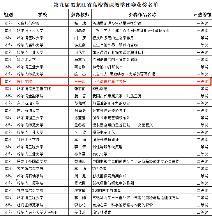 近日,beat365王丹阳老师参赛作品《小说语言的写作技巧》获得第九届黑龙江省高校微课教学比赛一等奖。