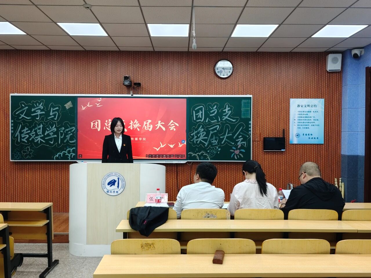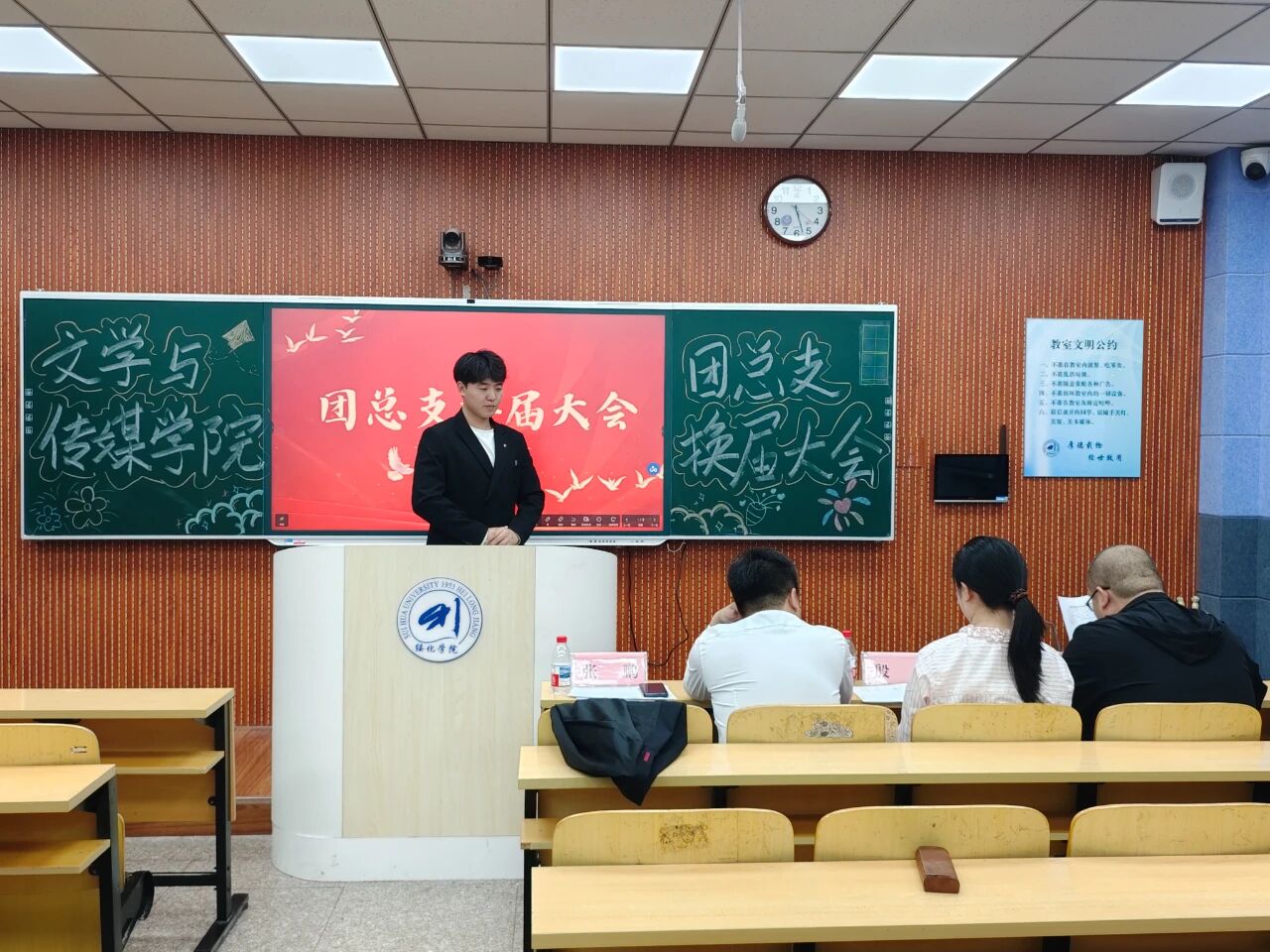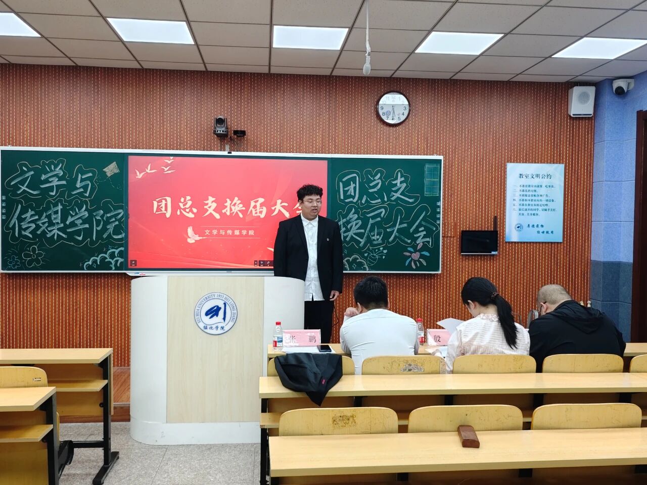 9月24日下午,beat365英国官方网站于汇文楼303和305教室召开第十六届团总支学生会换届大会。学院党总支副书记张鹏、2022级辅导员鞠亚林、2023级辅导员于小庆、2024级辅导员殷跃及全体学生干部出席。