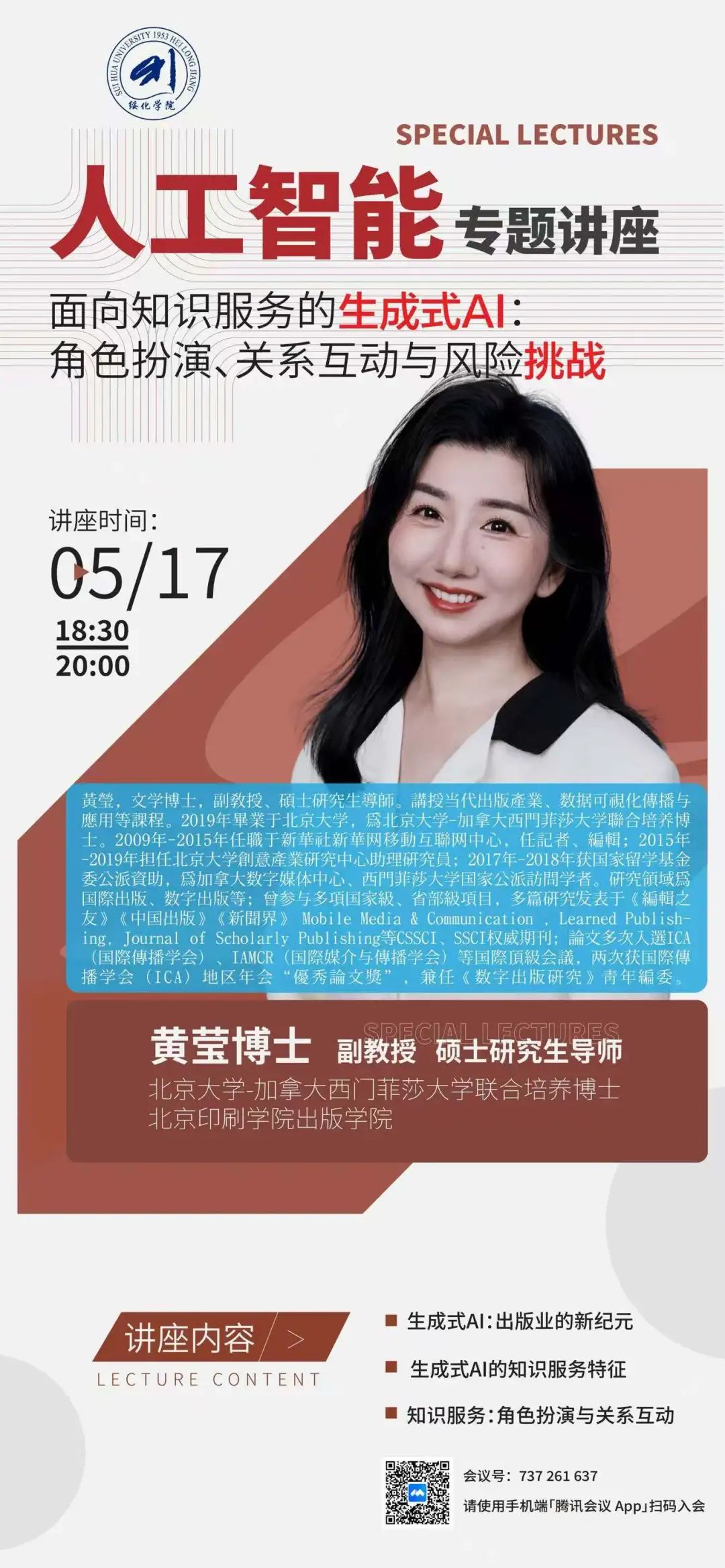 5月17日晚六点半至八点,beat365英国官方网站师生隔空聆听了来自北京印刷学院出版学院的副教授、硕士研究生导师黄莹博士的学术讲座,这也是beat365英国官方网站寒地黑土大讲堂的第480期讲座,由数字出版专业负责人吴春生老师主持。讲座的题目是:面向知识服务的生成式AI:角色扮演、关系互动与风险挑战。