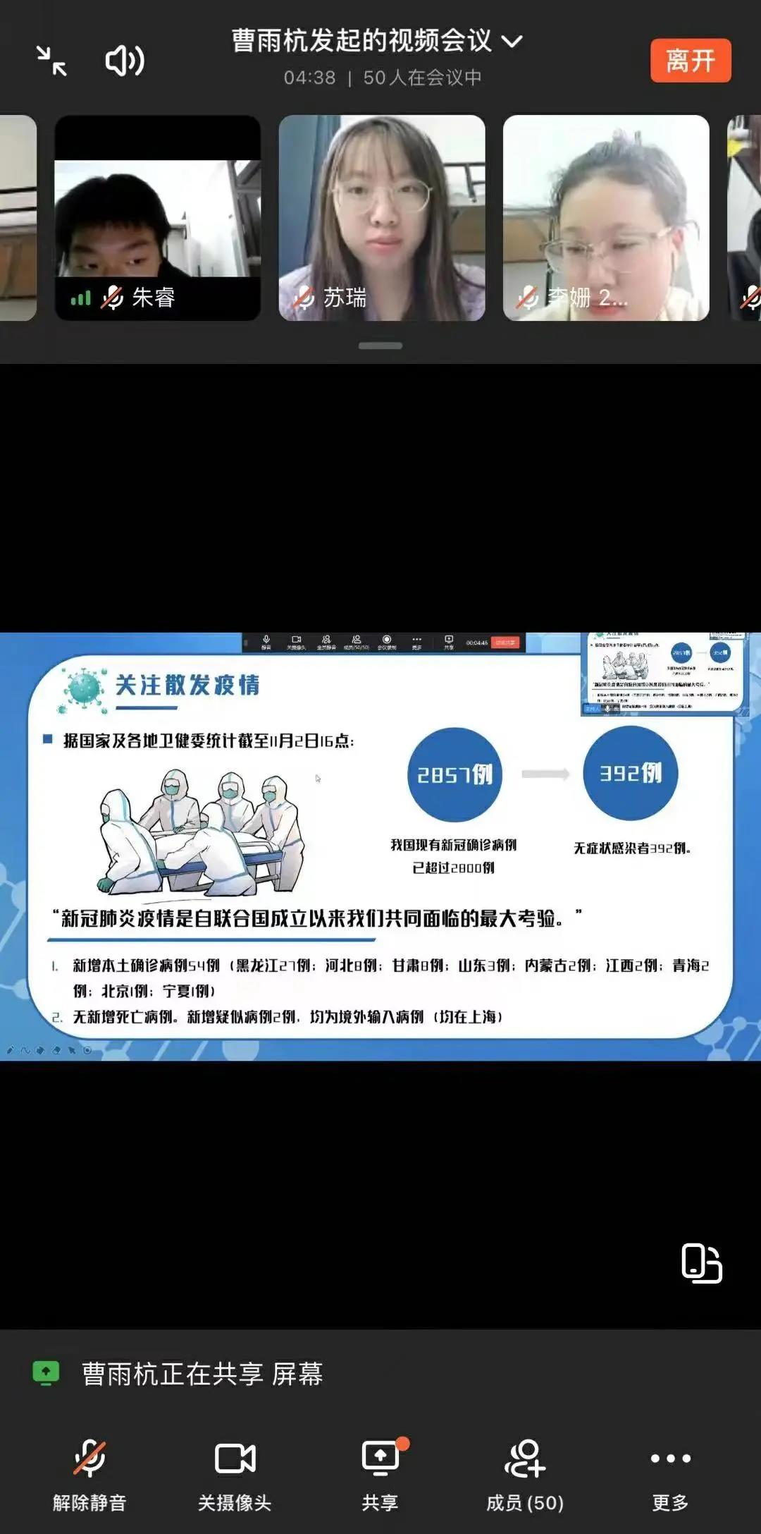 各班精心策划班会内容,充分利用微信群、QQ群、钉钉直播等多种平台,开展起形式多样、内容丰富、具有深刻教育意义的主题班会,并带领同学们学习相关疫情防控知识,向同学们介绍新型冠状病毒肺炎的“主要症状”、“如何识别”、“主要传播途径”、“错误舆论澄清”、“如何科学防护”等方面内容,做好相关知识普及,缓解学生焦虑情绪。同时,各班团支书还呼吁同学们要严格遵守学校疫情防控工作的要求,做到积极配合、不造谣、不传谣,自觉做科学的传播者、谣言的粉碎者、健康的守护者、家庭的关爱者,展现青年学生的责任与担当。