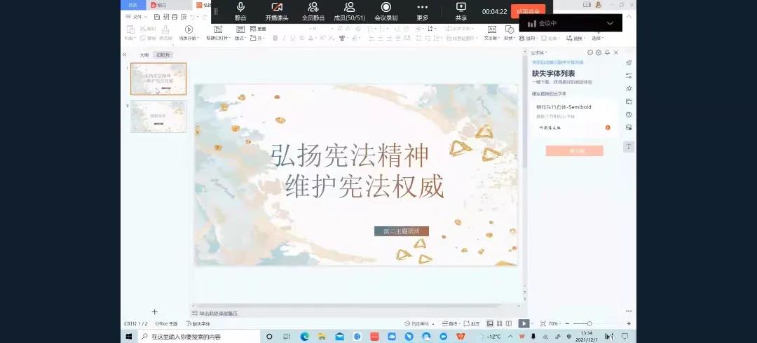 各班精心策划班会内容,制定丰富多彩、形式多样、周密详细的主题班会。首先,由各班团支书以PPT线上宣讲的形式向同学们介绍国家宪法日的来历、目的与意义,正确认识宪法的内涵与地位。随后,通过播放“我来讲宪法”微视频,培养同学们正确的基本法律意识和社会责任,树立广大团员青年的守法观念,懂得《宪法》是国家的根本大法,从而激发学生参与宪法宣传,做宪法的维护者和传承者。
