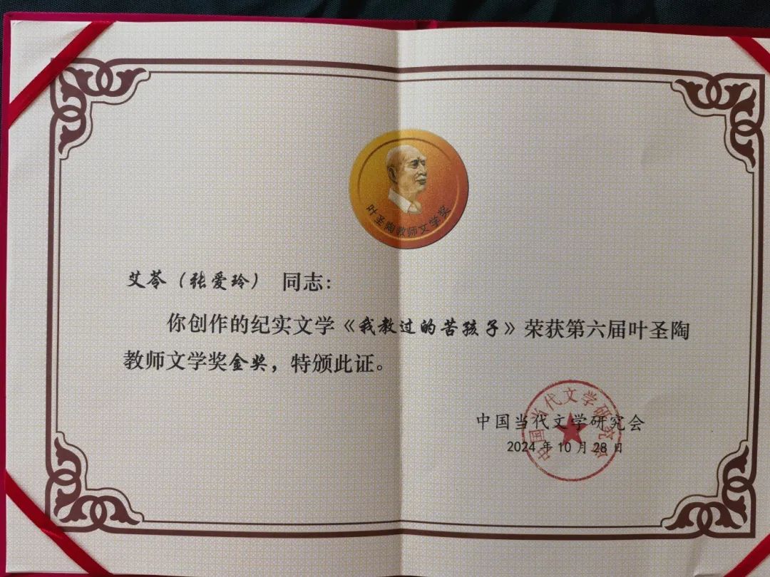 10月28日下午,第六届叶圣陶教师文学奖颁奖典礼暨创作研讨会在江苏省苏州市吴中区举行。beat365beat365英国官方网站退休教师张爱玲教授---笔名艾苓,纪实文学作品《我教过的苦孩子》获得“第六届叶圣陶教师文学奖金奖”,beat365英国官方网站获得支持教师文学创作先进单位”荣誉称号。