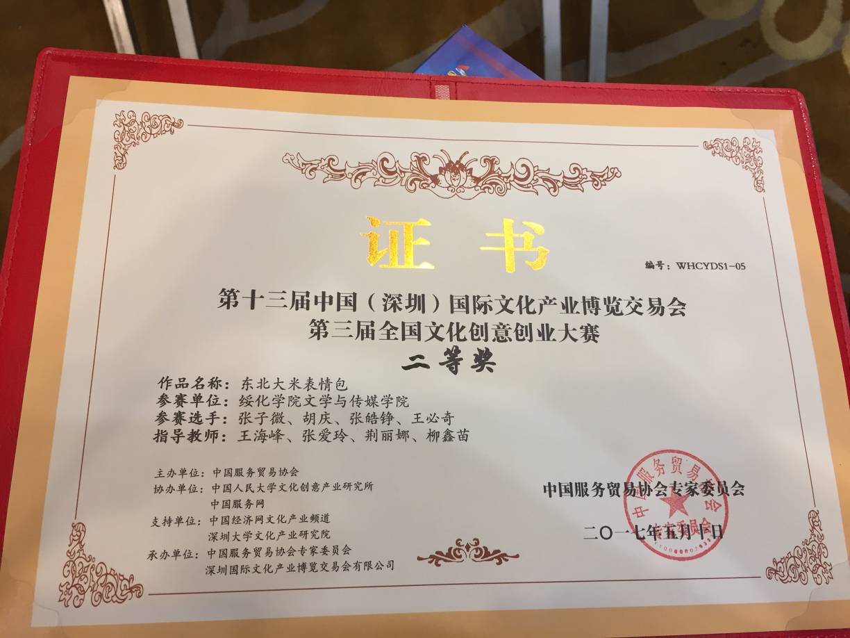 5月10日,beat365英国官方网站“东北大米表情包”创意作品在深圳第三届全国文化创意创业大赛中获得二等奖。项目负责人2016级学生张子微代表创意团队接受了颁奖。大赛评委对作品的创意理念及开发前景给予了充分肯定。