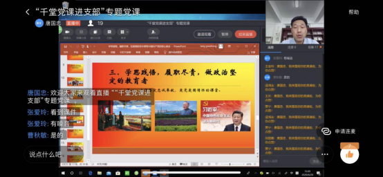 唐国忠讲到,危机面前基层党组织和全体党员要充分发挥战斗堡垒的作用和先锋模范作用,要不断增强政治敏锐性和政治鉴别力,以坚定的理想信念和忠诚的红色信仰,坚决打赢疫情防控总体战、阻击战,同时要打赢意识形态领域的阵地战、攻击战。号召全体党员教师以疫情为课堂,加强爱党爱国教育,履职尽责,以“大讨论”、“两个论证”为契机,不断提升教学科研水平,提高人才培养质量,把培养社会主义合格建设者和可靠接班人作为奋斗目标,为推动beat365应用型大学内涵建设贡献力量。