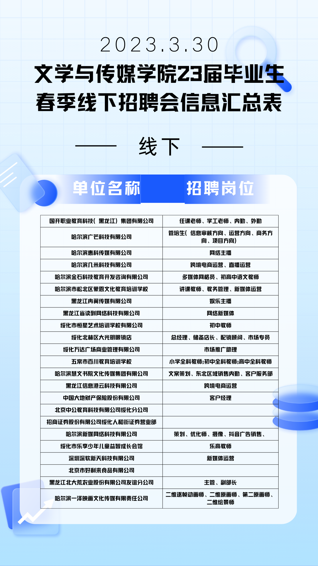 双选会时间3月30日10:00-12:00双选会地点汇文楼一楼大厅招聘会对象2023届毕业生