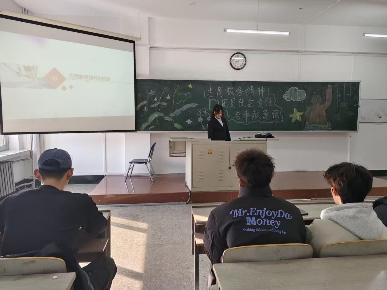 在团课上,王利卉从志愿服务精神的核心内涵切入,详细阐释了“奉献、友爱、互助、进步”精神的要义,结合志愿服务“自愿性、无偿性、公益性、组织性”的特点,系统梳理了其在社会补充、个人成长、精神引领层面的多重价值。她强调,志愿服务是共青团员践行社会责任的重要途径,更是共青团组织联系青年与社会之间的桥梁。