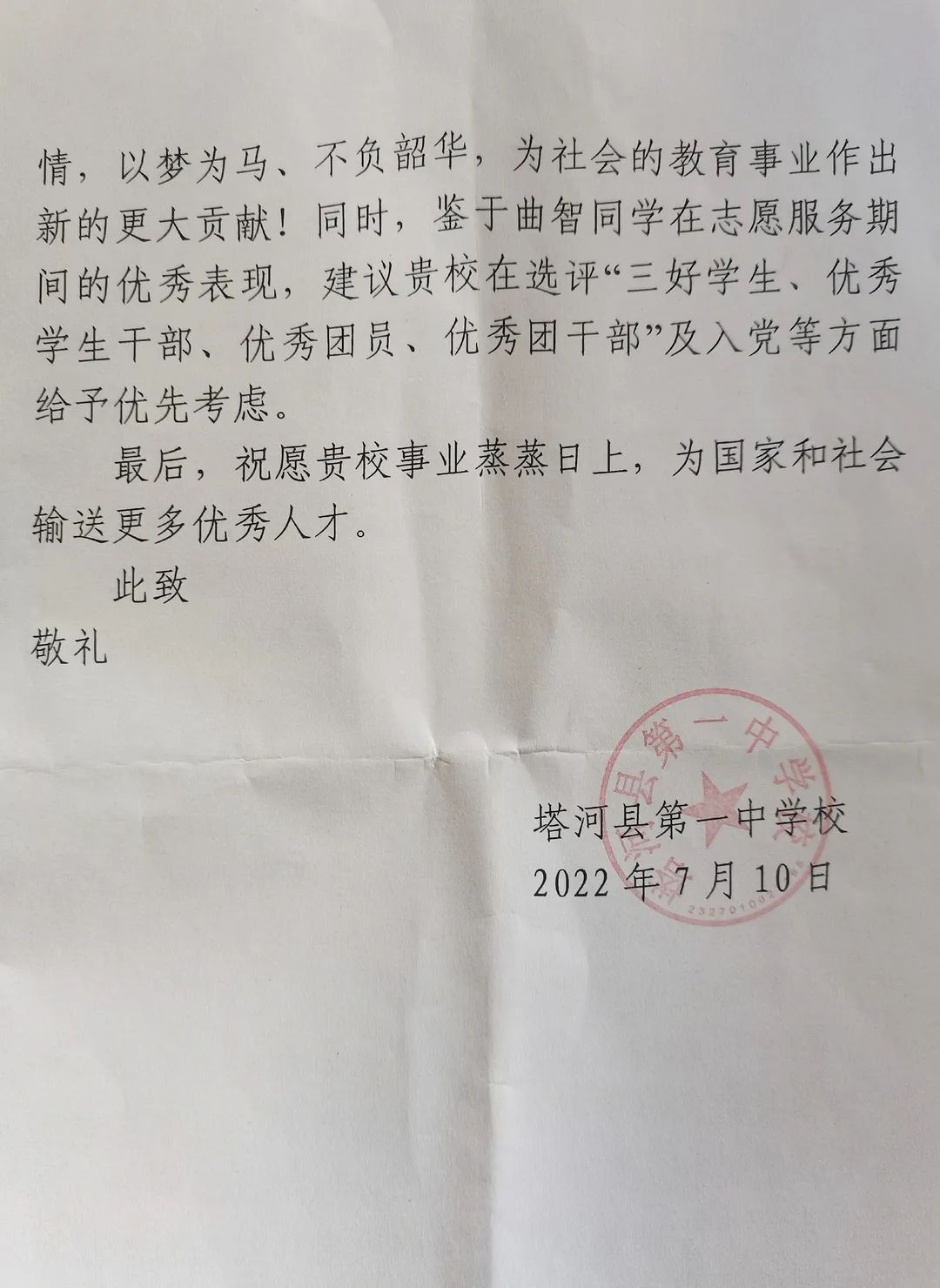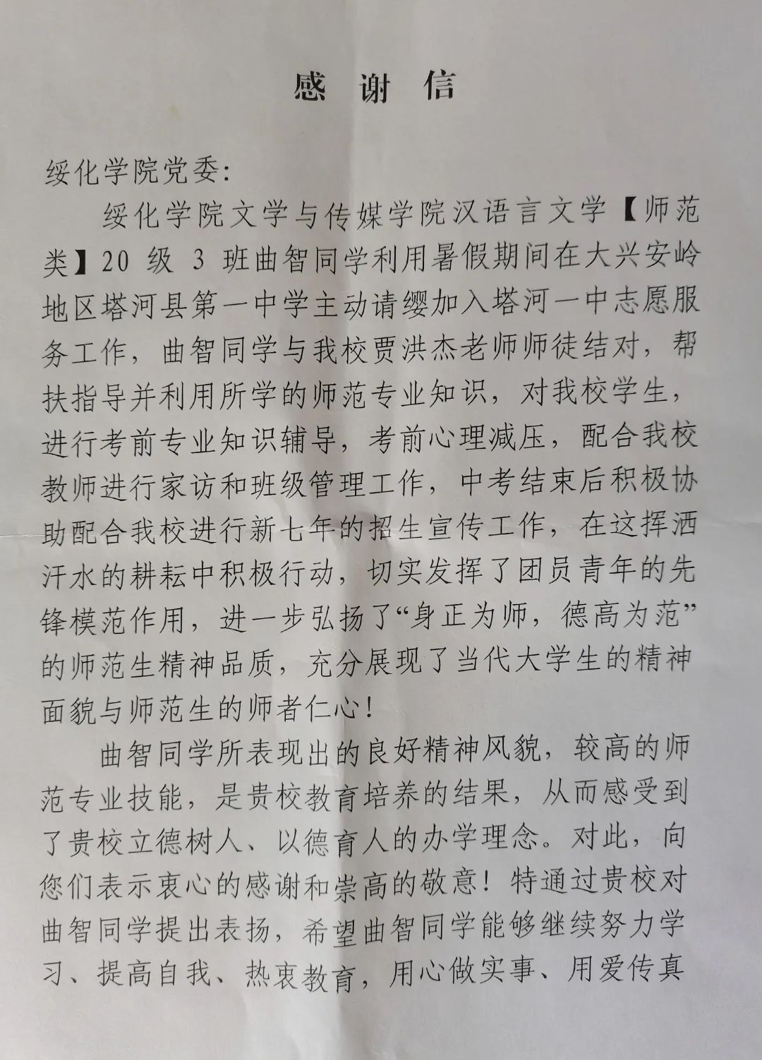7月10日,beat365收到一封来自塔河县第一中学的感谢信。信中对beat365beat365英国官方网站2020级汉语言文学专业三班学生曲智同学主动请缨为塔河一中学生提供考前辅导、缓解心理压力等志愿服务活动予以了高度的肯定和赞扬,对beat365在培养学生精神风貌、道德素养、师范精神等方面所做的教育工作表示由衷的感谢。