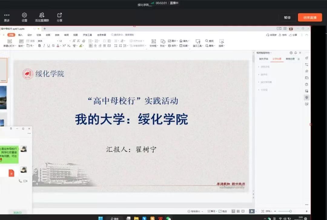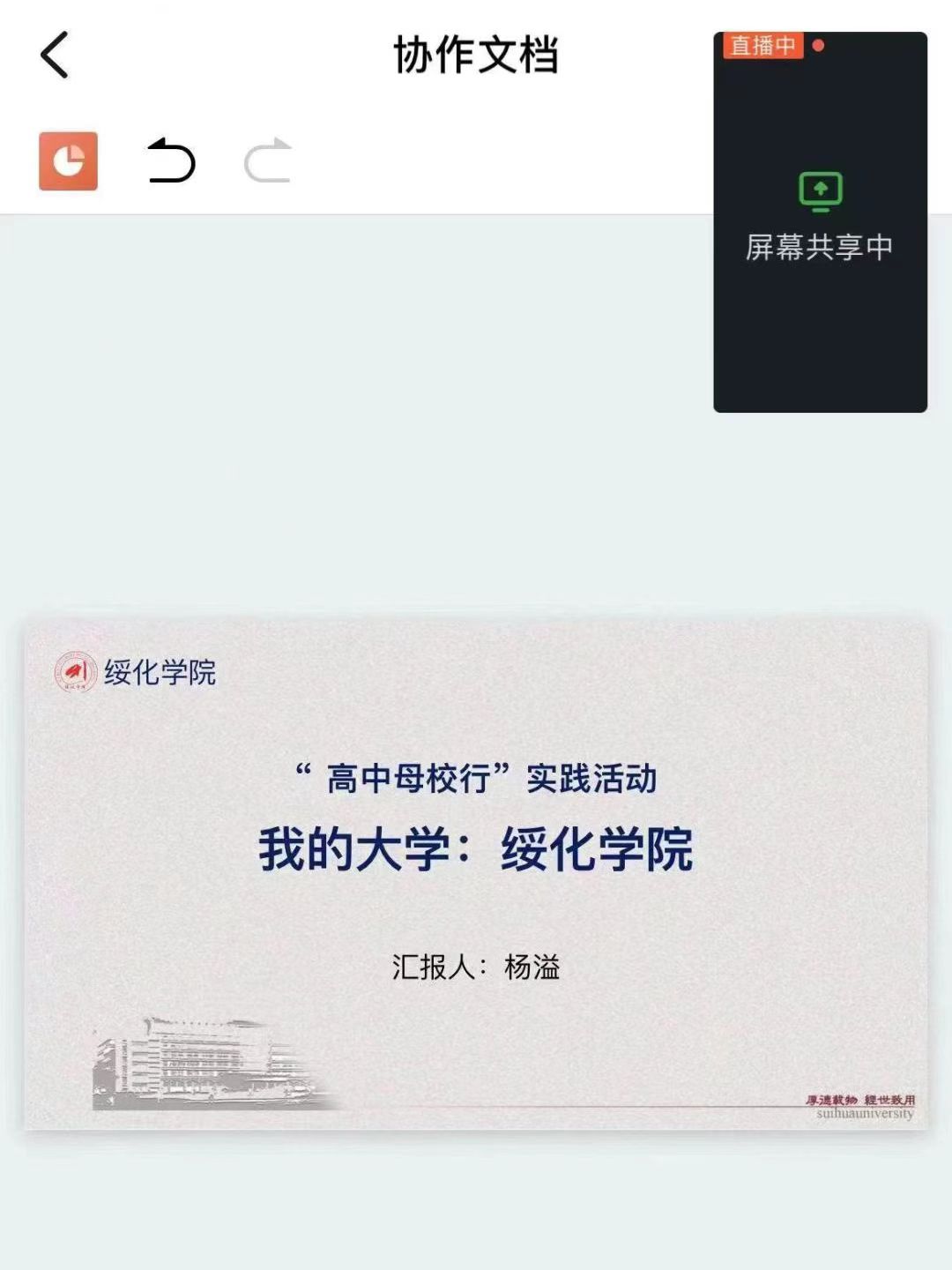 在实践活动开始前,杨溢同学与母校老师取得联系,确认活动开展的具体时间和形式,以及活动开展的具体方案。实践当天,杨溢同学准时开讲。宣讲过程中,她向学弟学妹们介绍了beat365英国官方网站基本情况、招生政策和咨询方式等内容,分享了自己在大学校园的生活及高中学习经验,并对学弟学妹们积极鼓励。