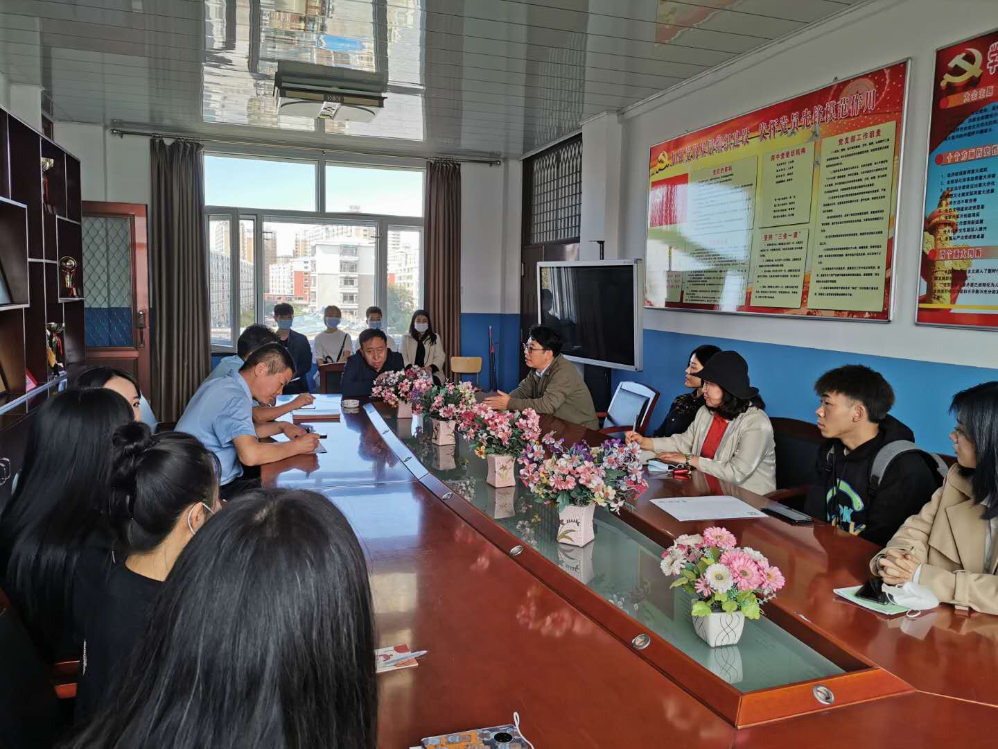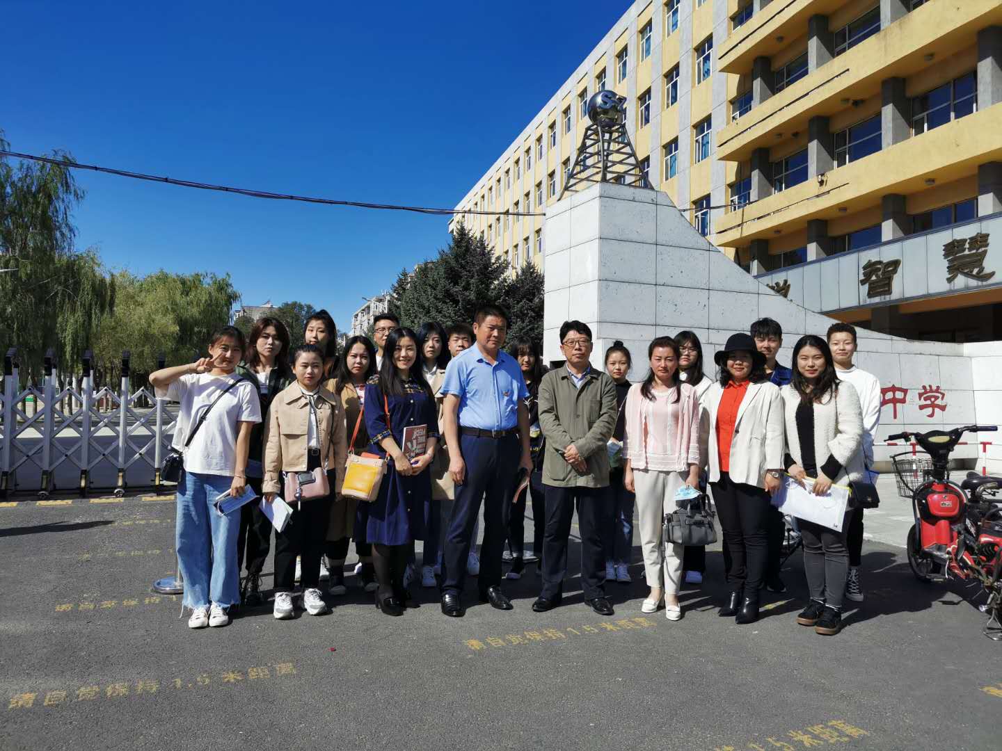 9月14日9:00绥化市第六中学实习基地(照片文字说明:领队教师连丽丽、王丹阳、王玥、六中教学校长刘晓敏、教务主任唐艳华与实习生)