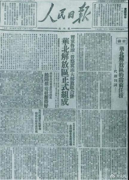 1948年6月15日,晋冀鲁豫解放区《人民日报》与《晋察冀日报》合并后出版的《人民日报》创刊号。