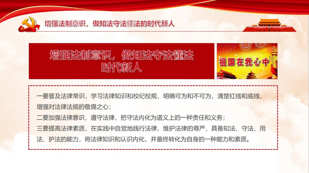 一、普及法律常识。学习法律知识和校纪校规,明确可为和不可为,分清红线和底线,增强对法律法规的敬畏之心;二、加强法律意识。遵守法律,把守法内化为道义上的责任和义务;三、提高法律素质。在实践中自觉地践行法律、维护法律的尊严,具备知法、守法、用法、护法的能力,将法律知识和认识内化,并最终转化为自身的准则和素养。