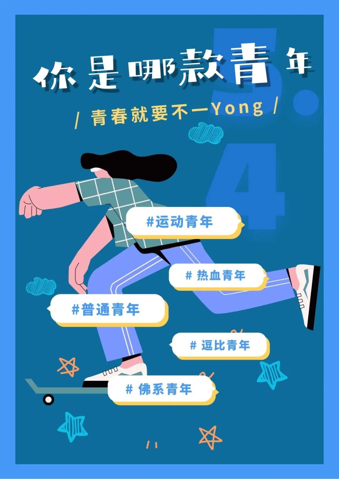 今天展播新媒体海报设计佳作奖艺术设计学院视觉传达设计专业刘沙的作品:《你是哪款青年》