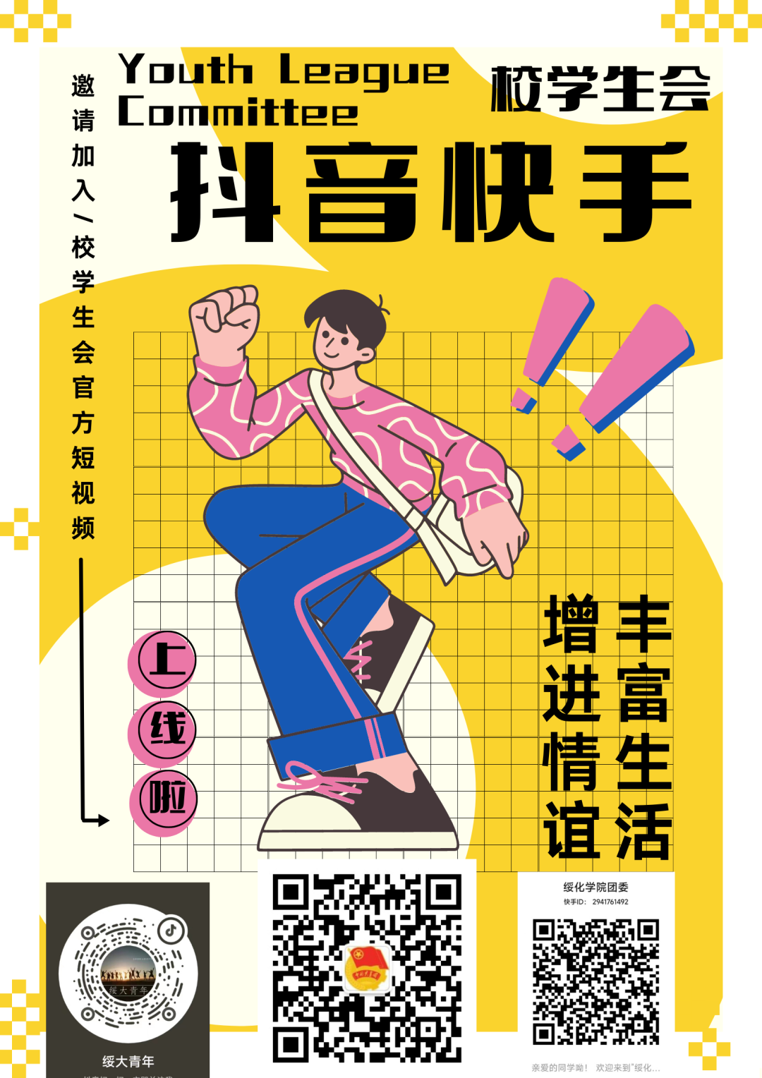 我们的抖音、快手账号名称分别为:绥大青年、beat365英国官方网站团委,欢迎各位同学进行关注与评论。