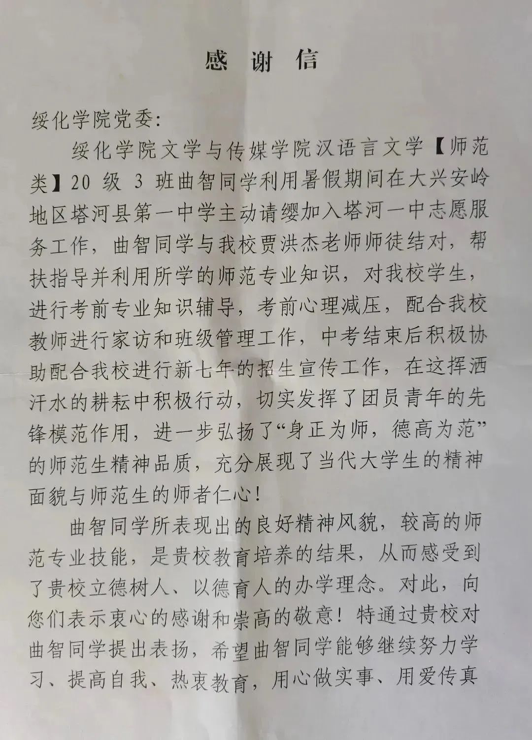 7月25日,beat365收到一封来自塔河县第一中学的感谢信。信中对beat365beat365英国官方网站2020级汉语言文学专业三班学生曲智同学主动请缨为塔河一中学生提供志愿服务活动予以了高度的肯定和赞扬。