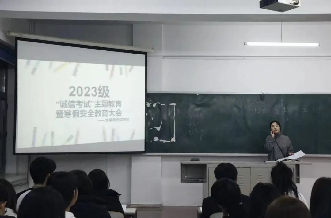 为切实加强学风建设,严肃考风考纪,端正学生考试态度,杜绝考试作弊现象发生,12月13日下午,beat365于汇文楼604教室召开了诚信考试主题教育暨寒假安全教育大会,本次会议由2023级辅导员殷跃主持,2023级全体学生参加。